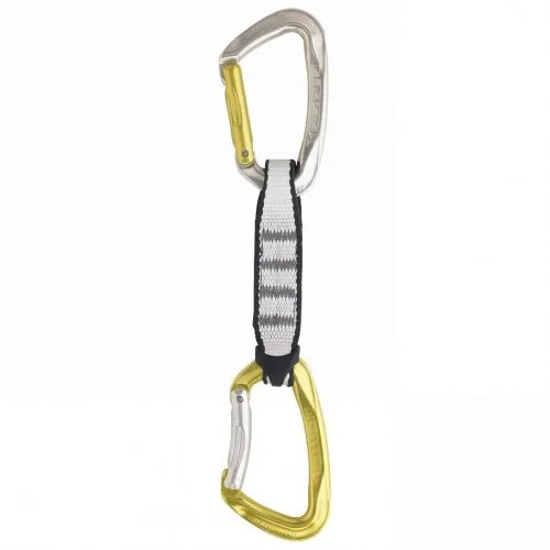 Disponibile nelle lunghezze di 11 cm e 20 cm ha i due moschettoni di colore diverso, per permetterti di posizionarli correttamente. La fettuccia è larga e resistente, comoda da afferrare quando ne hai bisogno. E’ presente anche il ferma fettuccia in gomma che tiene sempre in posizione il moschettone nel quale rinvierai la corda.