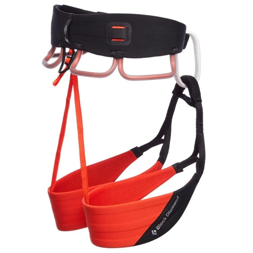 Per regolare la zona della vita è presente una comodissima fibbia, mentre i cosciali sono fissi. A tua disposizione ci sono quattro comodi anelli porta materiale stampati a pressione e un quinto anello posteriore. Sono presenti anche due slot per i porta viti da ghiaccio.