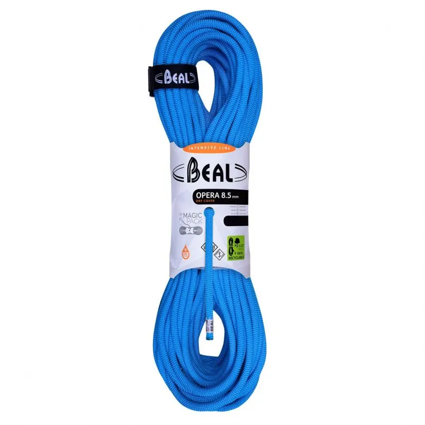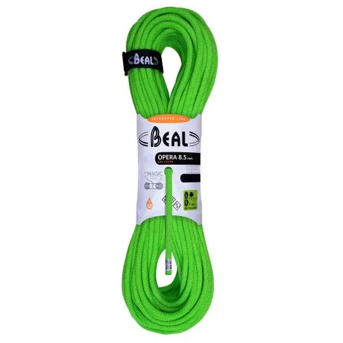 Beal Opera 8.5 mm è una corda singola certificata anche come mezza e gemella. Ultraleggera, fluida e polivalente è consigliata per arrampicatori esperti se usata come singola.
