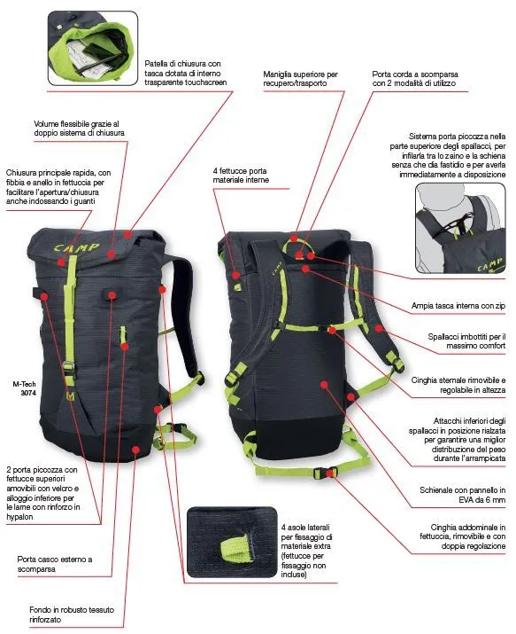Camp M-Tech è uno zaino pensato per l’alpinismo, per l’arrampicata su ghiaccio e per tutte quelle uscite in cui la leggerezza gioca un ruolo di fondamentale importanza.