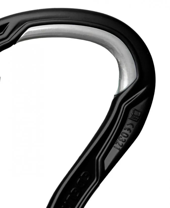 Un furbissimo inserto in acciaio nella parte superiore previene il consumo veloce del moschettone dovuto al continuo sfregamento della corda o delle placchette in acciaio.