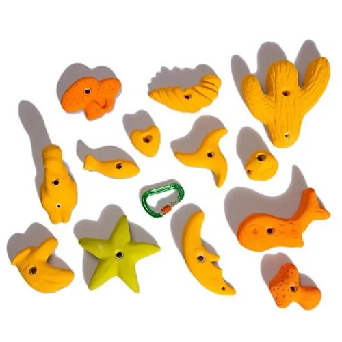 Il set Smog contiene tredici prese da arrampicata di varie forme, realizzate in poliestere, ideali per bambini.