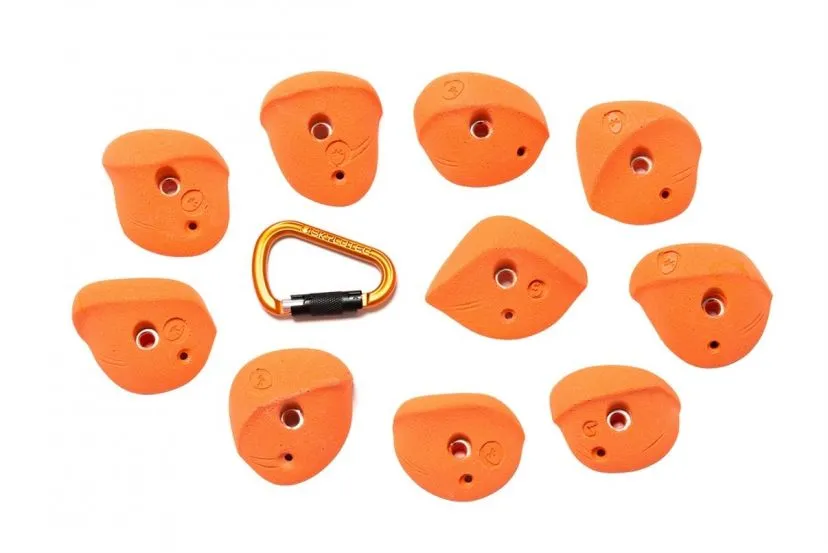 Dieci prese per l’arrampicata Smog che puoi usare come buone maniglie in verticale o per tirare forte in strapiombi più o meno pronunciati. Sono fatte in poliestere.