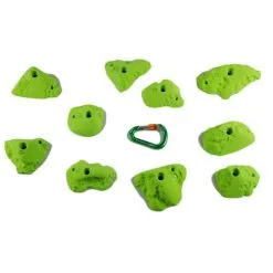 Il set Smog contiene dieci prese svase e pinze medie da arrampicata, realizzate in poliestere.
