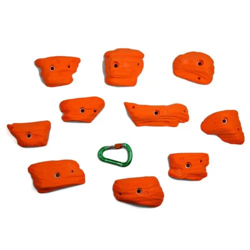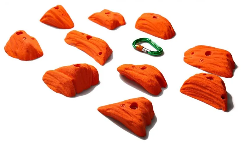 Il set Smog contiene dieci prese svase e pinze medie da arrampicata, realizzate in poliestere.