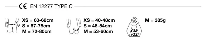 L’imbottitura in vita e nei cosciali è ventilata e confortevole a contatto con la pelle. Ha quattro ampie asole portamateriale rigide e il supporto per chiodi da ghiaccio!